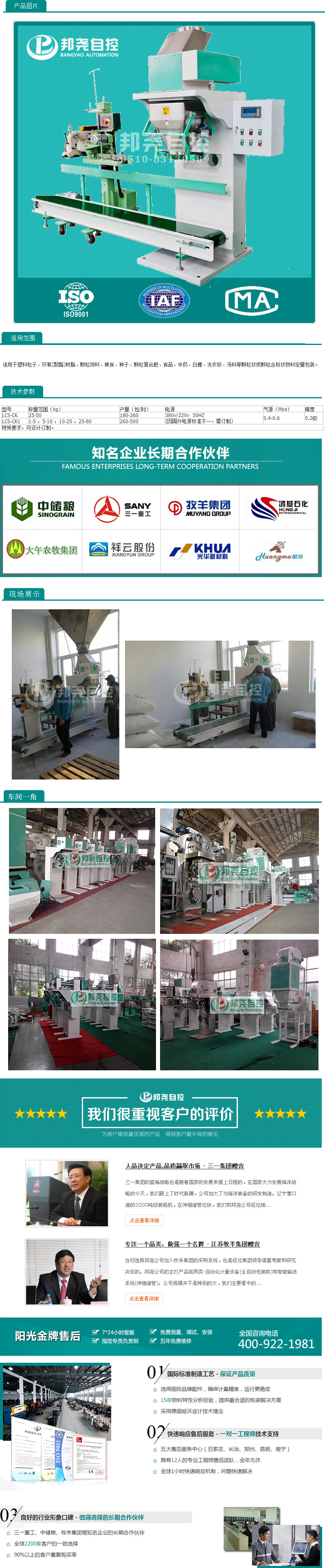 適用于塑料粒子、環氧(聚酯)樹脂、顆粒飼料、糧食、種子、顆粒復合肥、食品、中藥、白糖、洗衣粉、湯料等顆粒狀或顆粒含粉狀物料定量包裝。